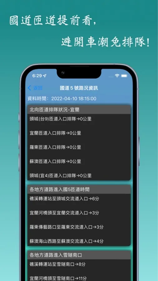 - 根據政府提供的匝道排隊預估時間,呈現給您。