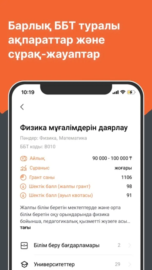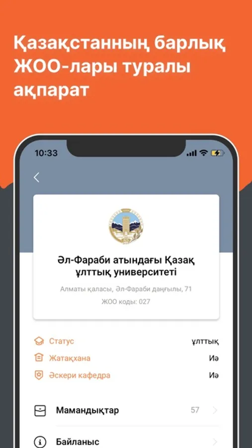 ⁃ Жоғарғы оқу орындары жайлы толық ақпарат. Әр мамандық бойынша рейтингі, оқу ақысы, жатақханасы және т.б. артықшылықтары көрсетілген.