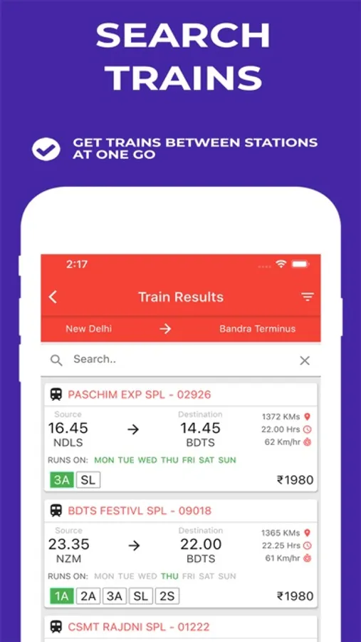 Find Indian Railways Trains between two stations - by entering Source station and Destination station with date and we will find trains for you with all enquiry option by clicking on trains list