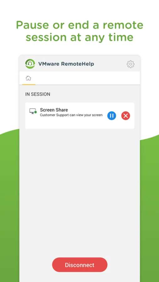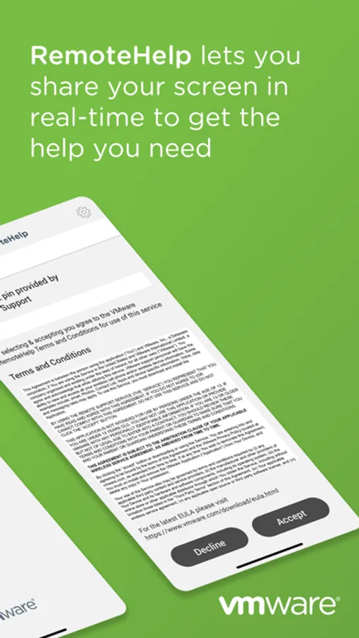 VMware RemoteHelp™ is a remote support app that enables you to securely share your screen with customer support agents in real-time. To launch a remote session, simply download the app and enter the 4-digit pin provided by the support rep. You can pause or end remote sessions at any time.