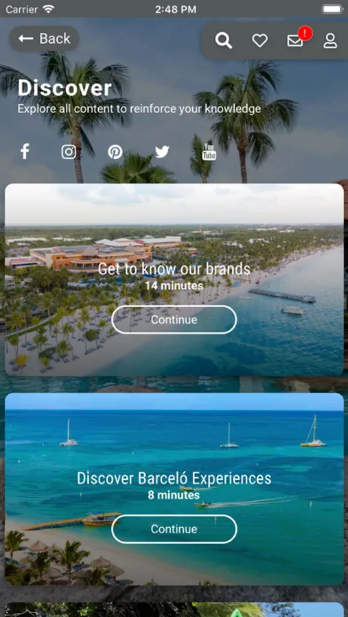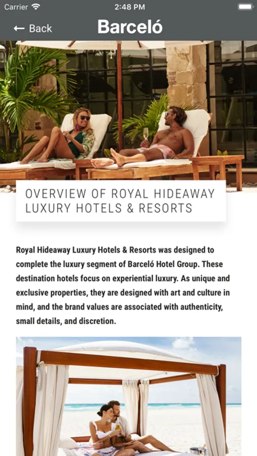 On behalf of Barceló Hotel Group, welcome to the Barceló Hotel Group Mobile Sales Companion. This mobile app has been designed to help you easily discover and sell Barceló like a pro, anytime or anywhere – helping maintain your expertise. The content is all-new, updated regularly, easily sharable, and has something for everyone. Explore our brands, experiences, resources and learn more about planning the dream wedding with Barceló Hotel Group. Enjoy!