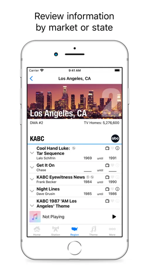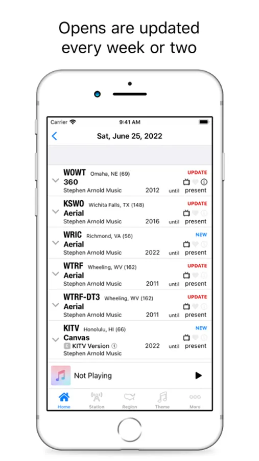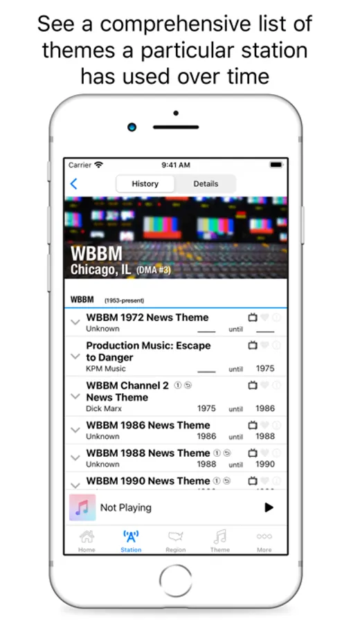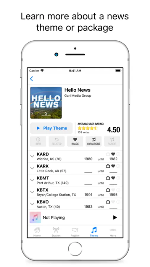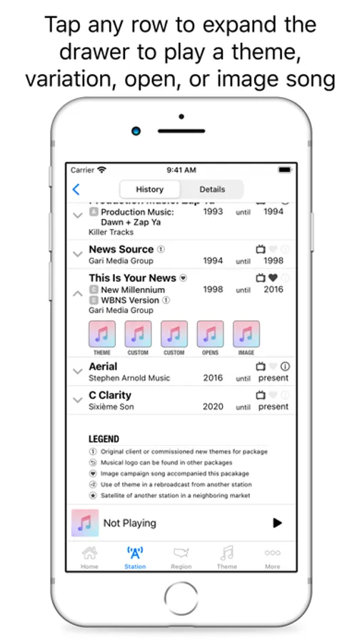 Within the app users can search and review news music usage by station name, market, state, composer, and theme. News themes, news opens, and image campaign songs all can be played within the app.
