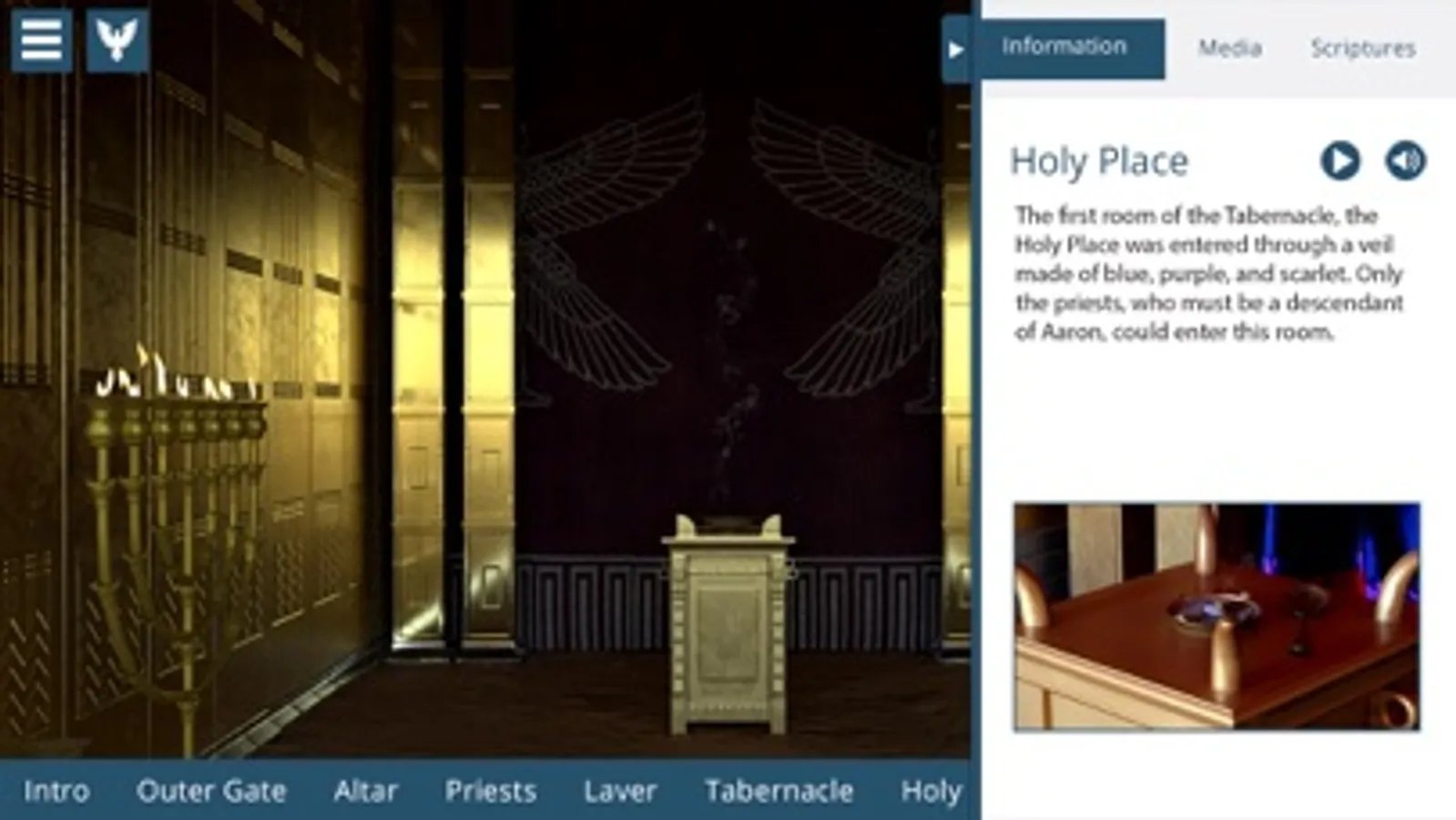Click the side panel to receive general information, additional media, and scripture references, or pause and play the animations. We designed the app so you can have fun as you explore and learn. The research and content provided were done by leading scholars in the field to enable the most immersive and interactive experience possible.