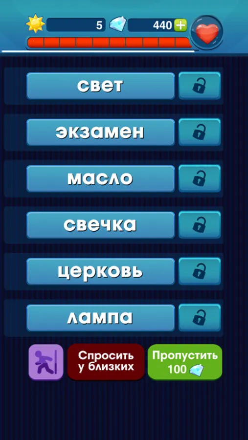 Правила просты, пять из шести слов, объединяет что-нибудь общее. Шестое же - отличается от остальных, но закрытые звёздочками буквы не будут давать Вам понять какое именно слово лишнее. Каждый правильный ответ дает жизнь, и наоборот. Если используете все десять жизней - не огорчайтесь, через определённое время они восстановятся, и Вы продолжить игру!