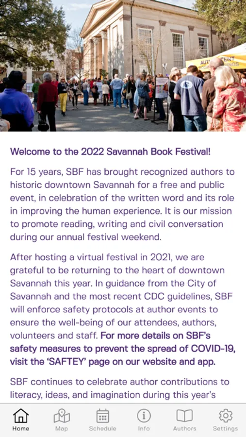 The Savannah Book Festival is an annual event, free and open to the public, in celebration of the written word and its role in improving the human experience. Our mission is to promote reading, writing and civil conversation. Use the Savannah Book Festival app to view author schedules, venue locations and directions, author bios and book information and more!