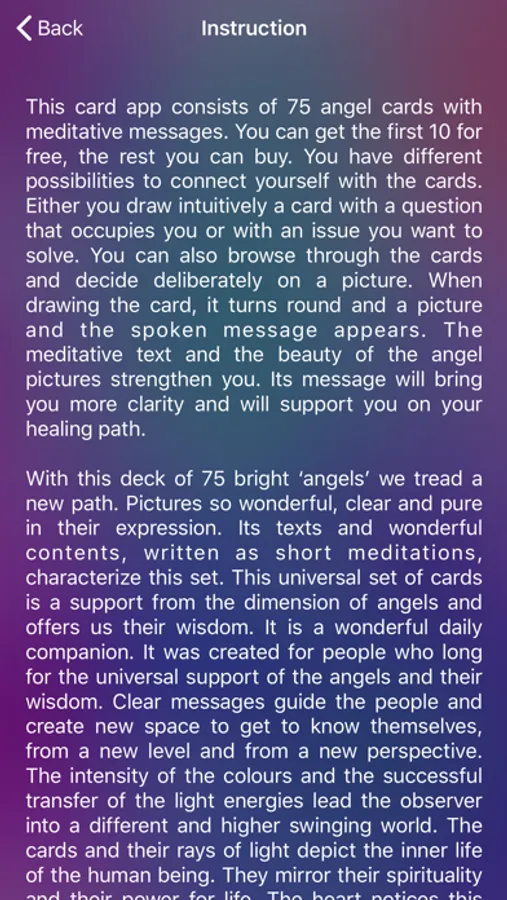 This card app consists of 75 angel cards with meditative messages. You can get the first 10 for free, the rest you can buy. You have different possibilities to connect yourself with the cards. Either you draw intuitively a card with a question that occupies you or with an issue you want to solve. You can also browse through the cards and decide deliberately on a picture. When drawing the card, it turns round and a picture and the spoken message appears. The meditative text and the beauty of the angel pictures strengthen you. Its message will bring you more clarity and will support you on your healing path.