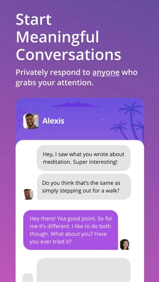 We are a community eager to interact with each other by exchanging ideas and learning about each other. Swiping is not how genuine people meet in real life. Instead, we make it very easy for you to find common interests and start meaningful conversations through our icebreakers.