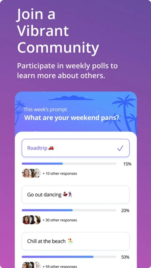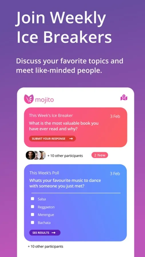 Icebreakers are a quick and fun way to learn about other member's personalities and interests. Our icebreakers consist of open-ended questions or polls, which everyone answers within a limited set of time. These can be a fun and convenient way to find matches based on their opinions, believes and values.