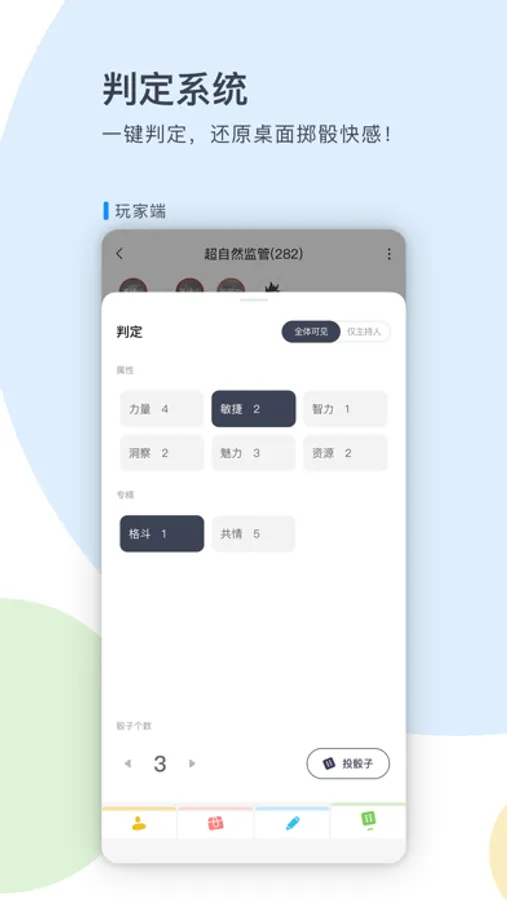 【房间功能,玩法丰富】 功能完备的剧本房间,支持语音、文字互动,并专为TRPG设计云角色卡、自动骰子等便捷工具。