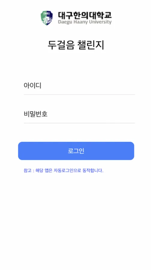 대구한의대학교 두걸음 챌린지는 대구한의대학교 재학생의 건강관리와 비교과 프로그램인 [두걸음 챌린지] 의 운영을 보조할 목적으로 제작되었습니다.