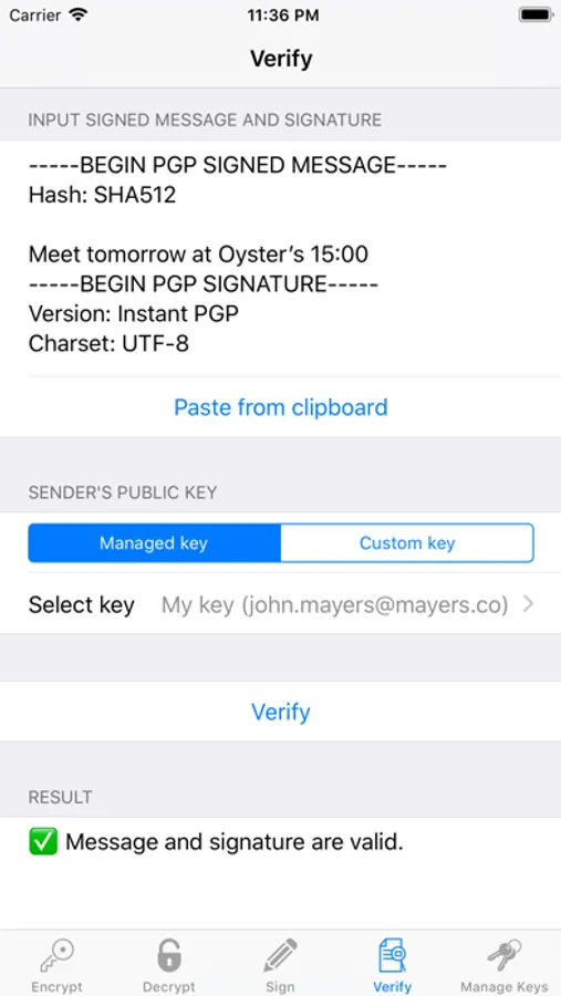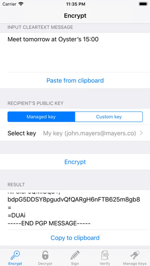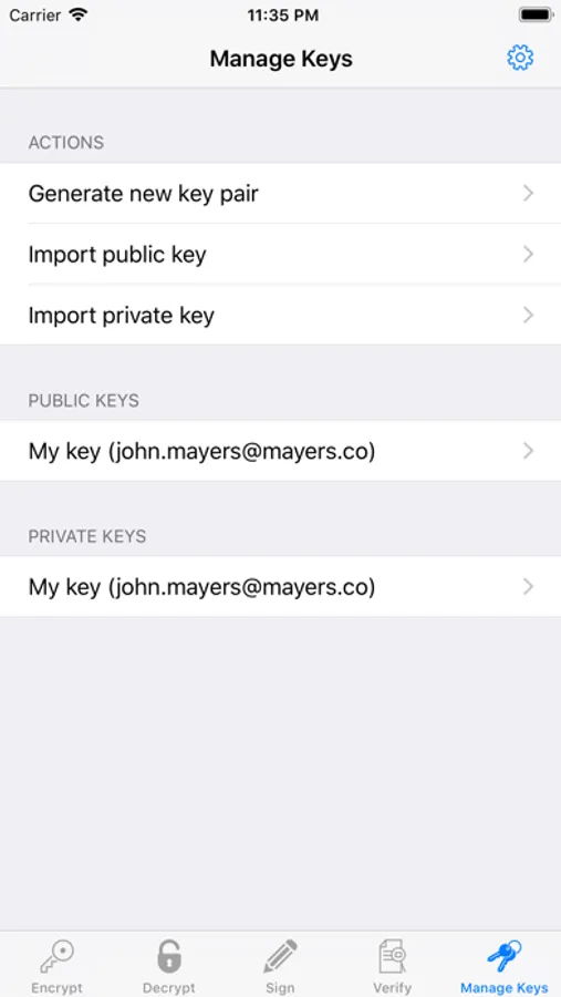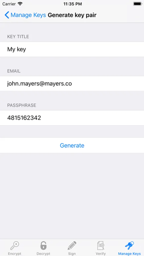 The app allows you to generate, import and export your public and private PGP keys in ASCII format.