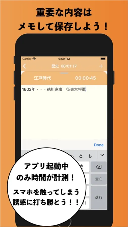 「歴史学習」の学習時間を計測しつつ、「江戸時代」の学習時間も計測できます。