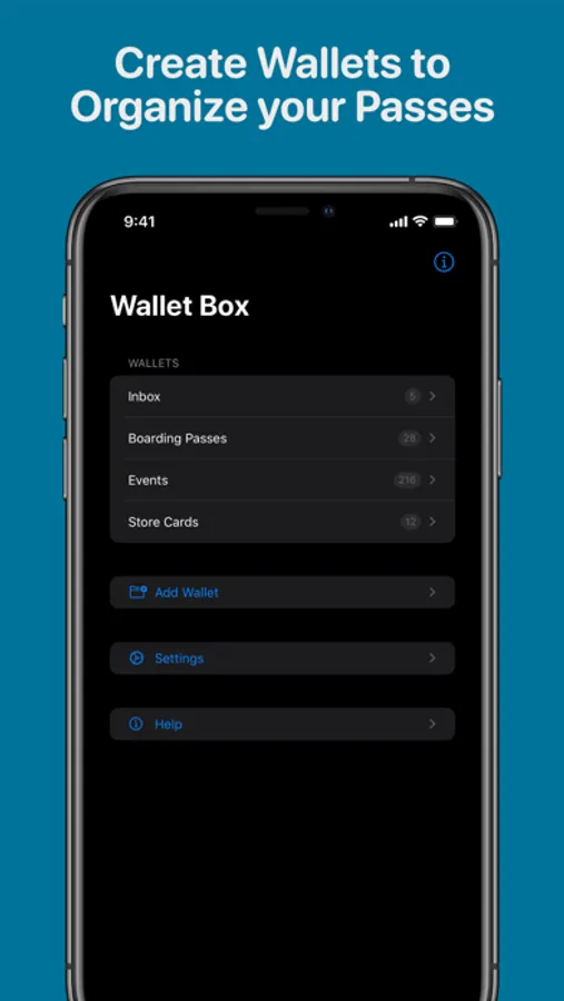 Create "Wallets" (folders) within Wallet Box to neatly organise your Passes.