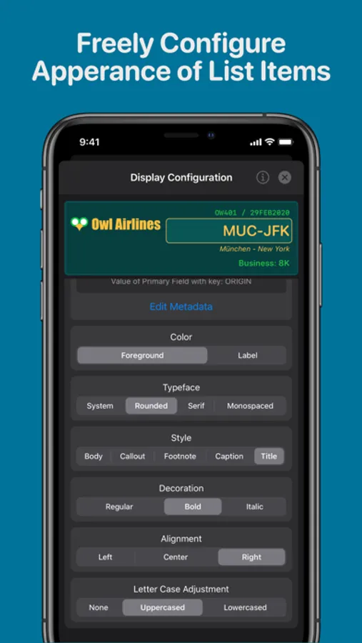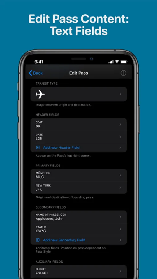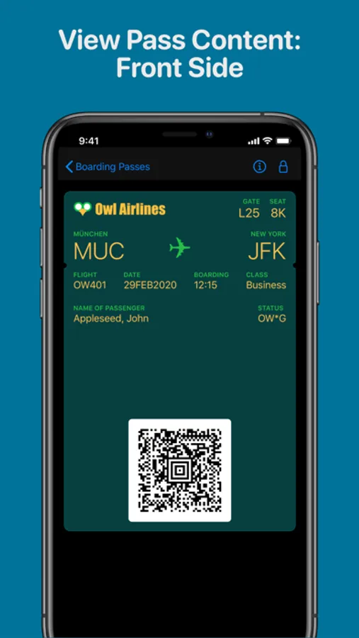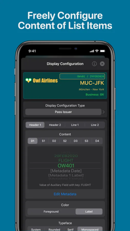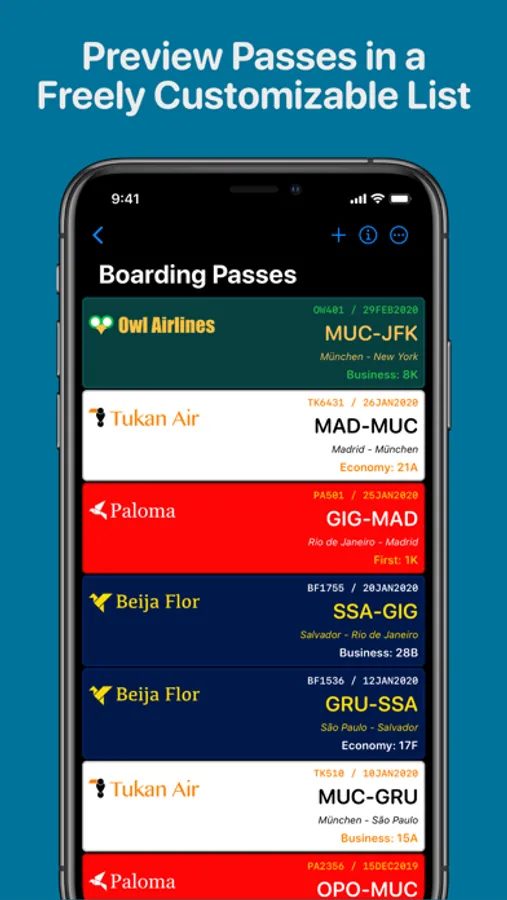 In each Wallet's main screen, Passes are displayed as small cards using the Pass's colors and logo image. Each Pass representation can display up to 4 freely customisable text lines containing each up to data items contained in the Pass (e.g. flight number, origin, destination, gate, seat etc).