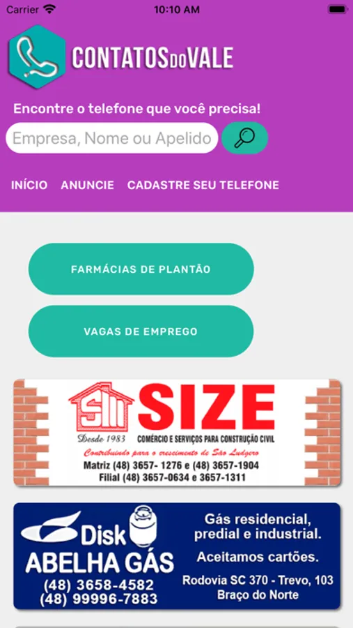 Este aplicativo foi desenvolvido para facilitar a busca por contatos telefônicos das cidades cadastradas. Digite o nome da pessoa ou da empresa no campo de busca ou clique no ícone referente ao tipo de empresa que você precisa encontrar.