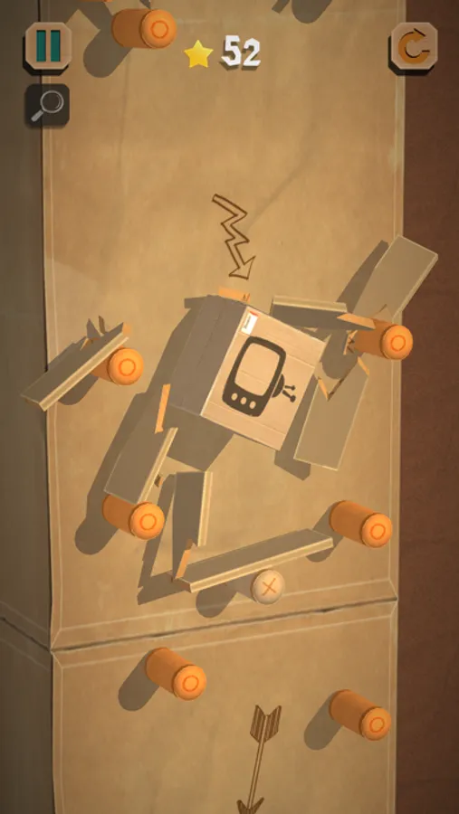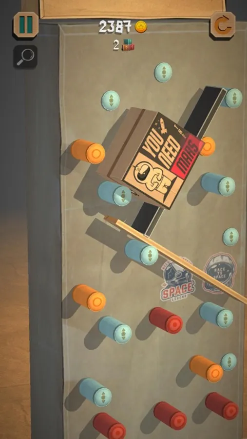 Set small pins and try to drop cardboard boxes into hole without damage them. Make a path for your boxes by pushing pins.