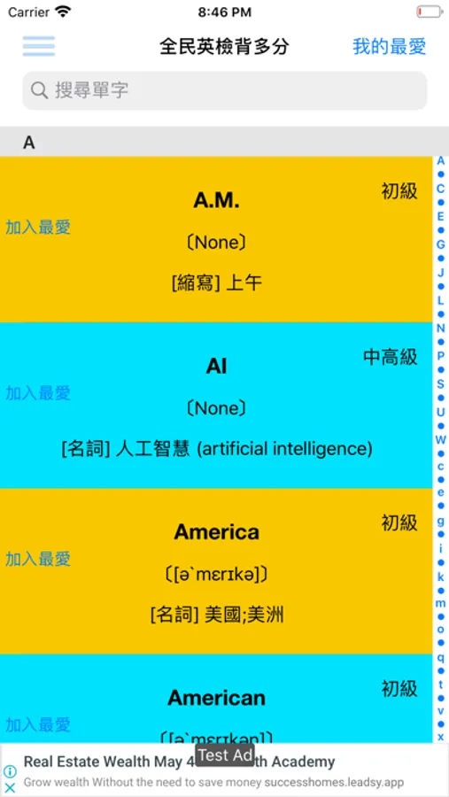 收錄GEPT全民英檢的「8,000 英文單字」,APP功能簡單易用,依照英文字母順序(A-Z)排列,並提供索引及搜尋功能