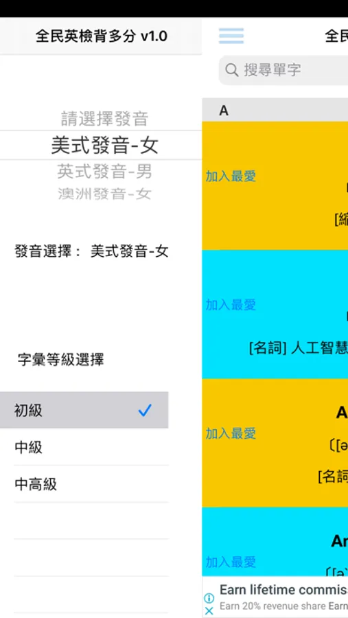 - 提供道地真人發音(三種發音腔調),點選單字即可發音,增強英文聽力必備