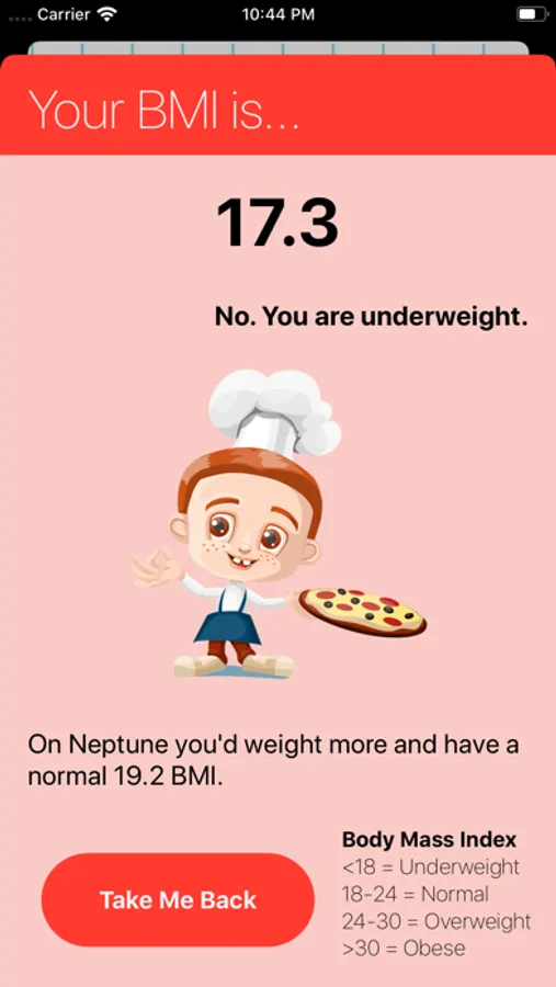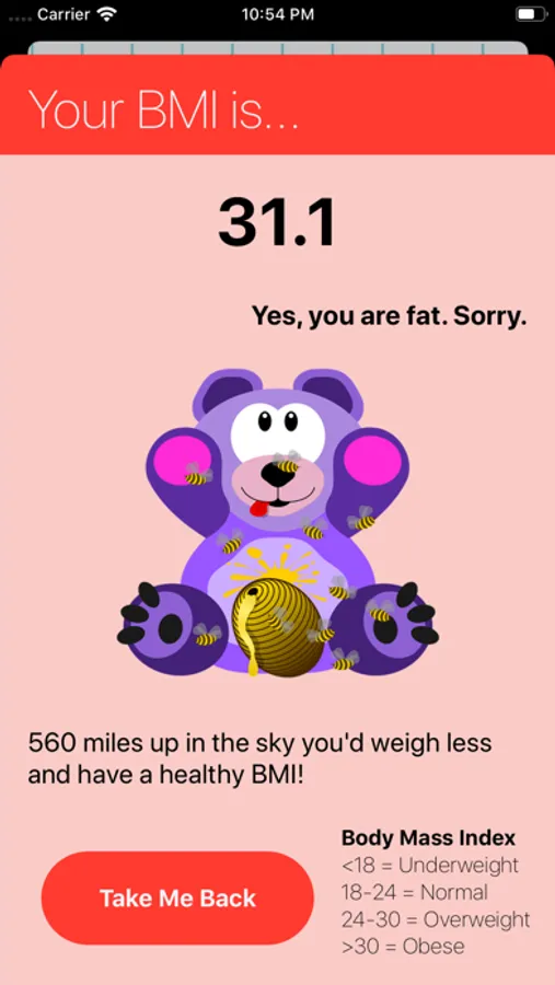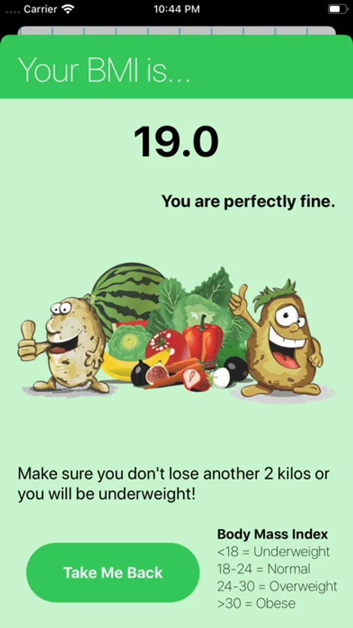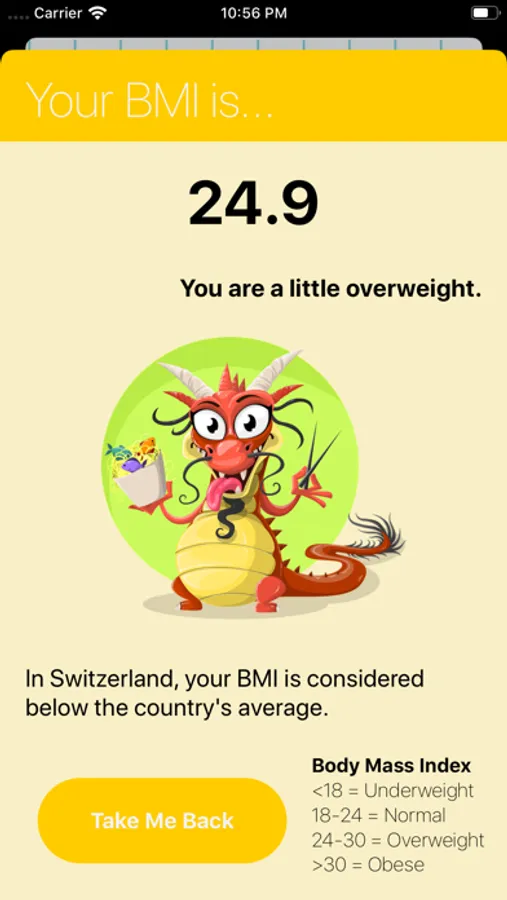 For your given height and weight, the app will provide you with your Body Mass Index. It also categorises that body mass index into one of four types: Underweight, Normal, Overweight and Obese. Keep track and stay healthy!