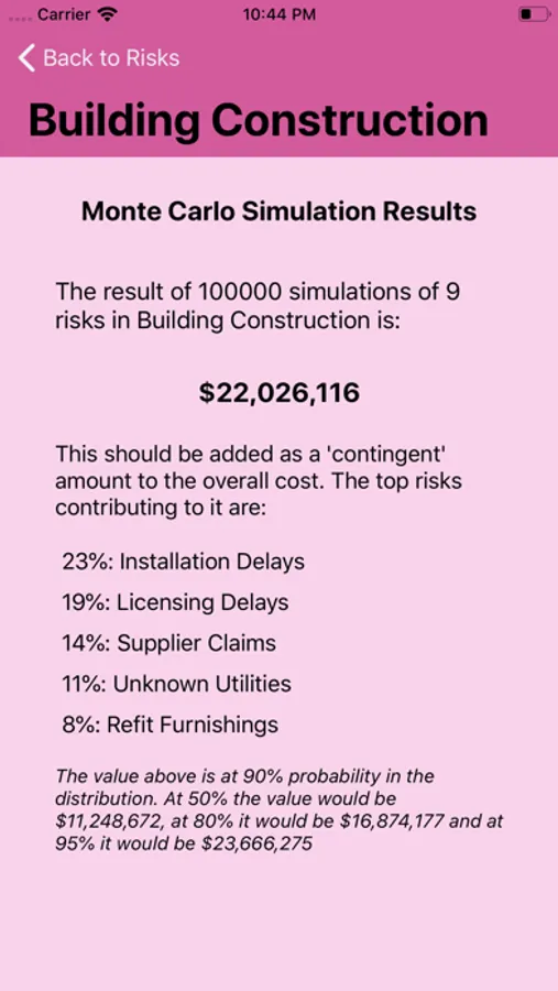 The app is a Monte-Carlo risk simulator that is capable of running hundreds of thousands of simulations to provide a quantified 'cost of risk or uncertainty' that should be factored into any decision. This is underpinned by well established data science and statistical math. The result is a single number that you should add to your overall cost as a contingency number.