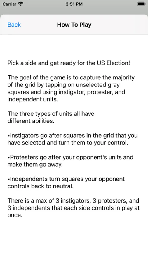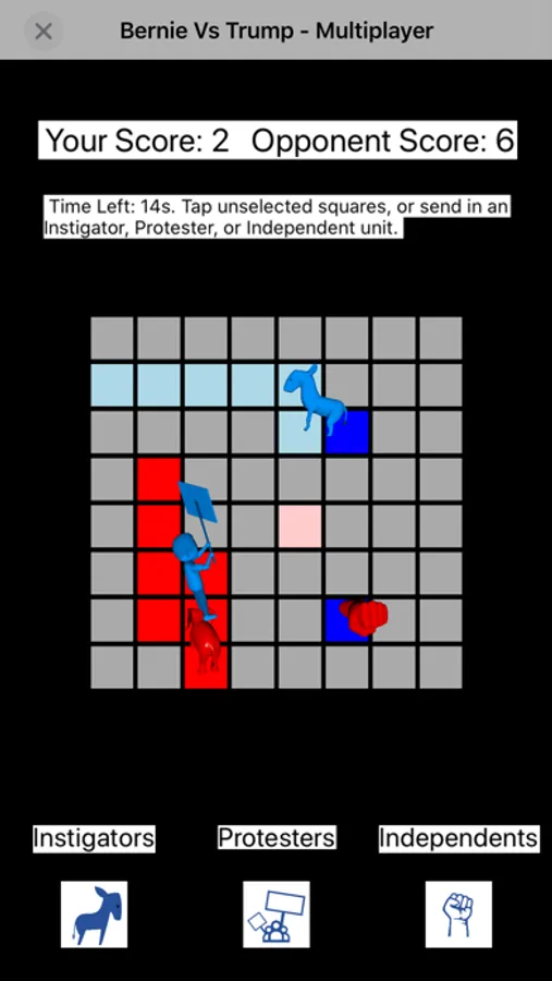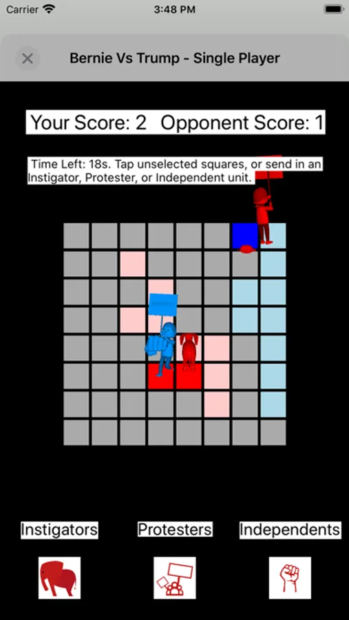 The goal of the game is to capture the majority of the grid by tapping on unselected gray squares and using instigator, protestor, and independent units.
