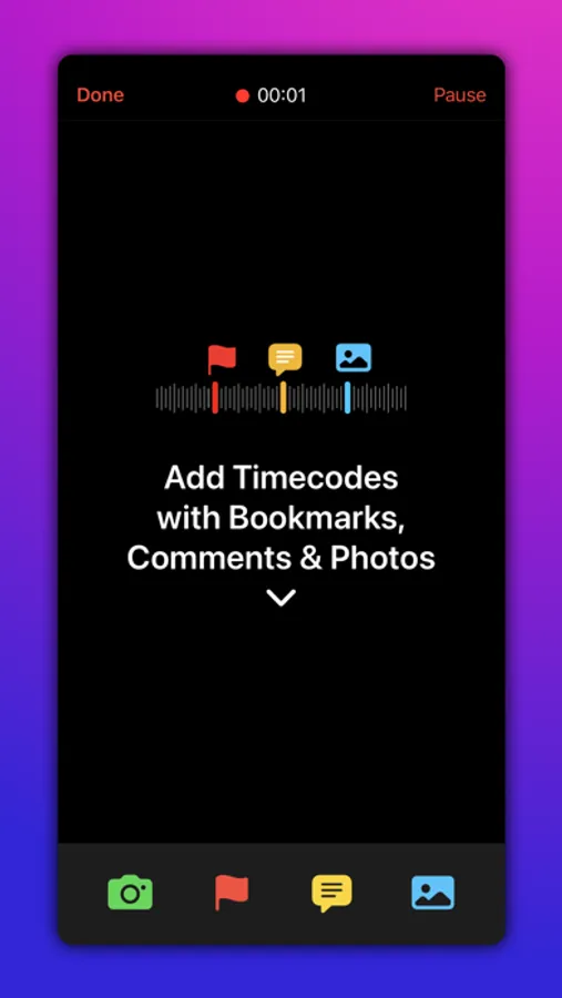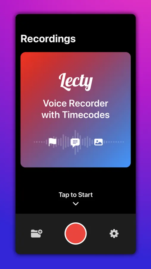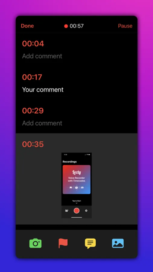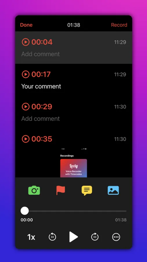 Lecty Audio Recorder Pro is a voice recorder with timecodes. As you create and listen to recordings, you can create timecodes by adding bookmarks, comments, and photos. As a result, you get a visual transcript of the audio recording, consisting of bookmarks, photos and comments, each of which is tied to the time they were added. Using the created timecodes, you can quickly navigate your recordings and instantly rewind the recording to the desired section by simply clicking on the desired timecode. Do you want to start listening to the recording from the moment you added a comment or photo? Just click on the timecode and listen.