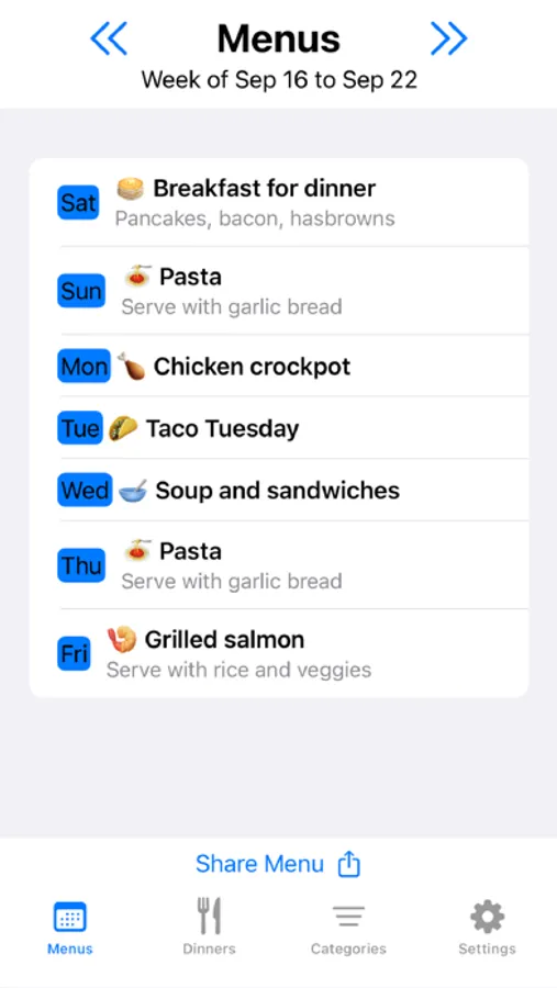 So, what's for dinner tonight? This free app will help you plan your dinner menu by storing your favorite dinners, and then letting you quickly plan the menu for upcoming weeks. This is a simple menu planner, and is not intended for finding or storing menus.