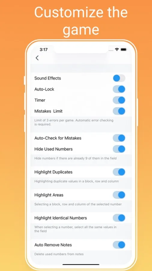 Keep your brain trained and try to pass the game on the EXPERT level. To make it easier you can use the app's flexible settings, notes on the game board, as well as undo the last action or use hints.
