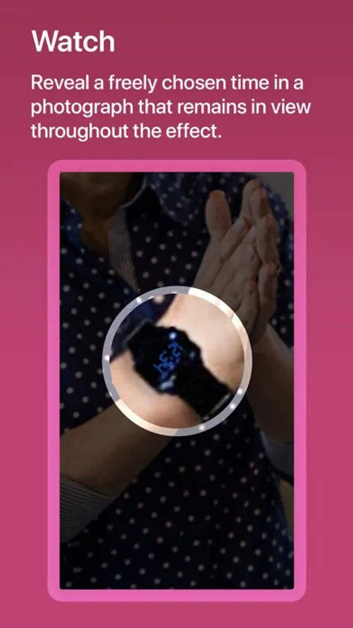 A revelation of a freely chosen time. Your spectator zooms in to a wristwatch in a photograph to find it's set to the time they just named.
