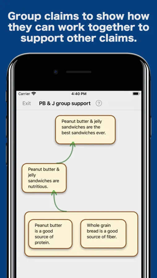 * With simple drags and taps, ArguMap users can easily group or ungroup claims, and connect or disconnect parts of a map. As a result, trying out different lines of reasoning is as easy as arranging pieces of paper on a table.