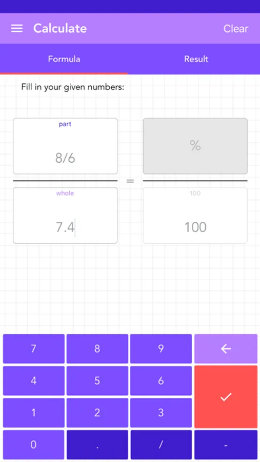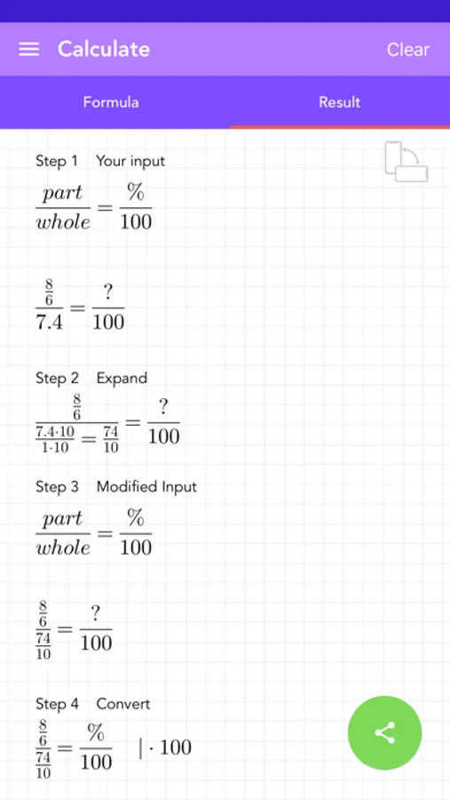 Percentage calculations are no problem anymore. For this, only 2 of 3 variables must be entered. All calculations are stored in the history. The final solution can be shared.