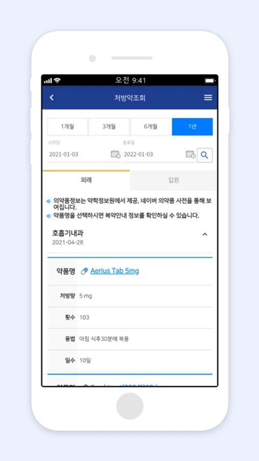 병원에서 처방 받은 약을 한눈에 확인할 수 있습니다