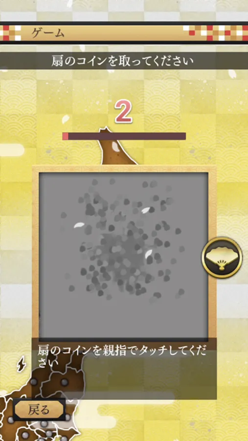 ゲームが始まると、扇のコインが現れます。親指を根元から大きく動かし、コインを触ってください。一定の数のコインを取得するご当地のパネルを取得することができます。
