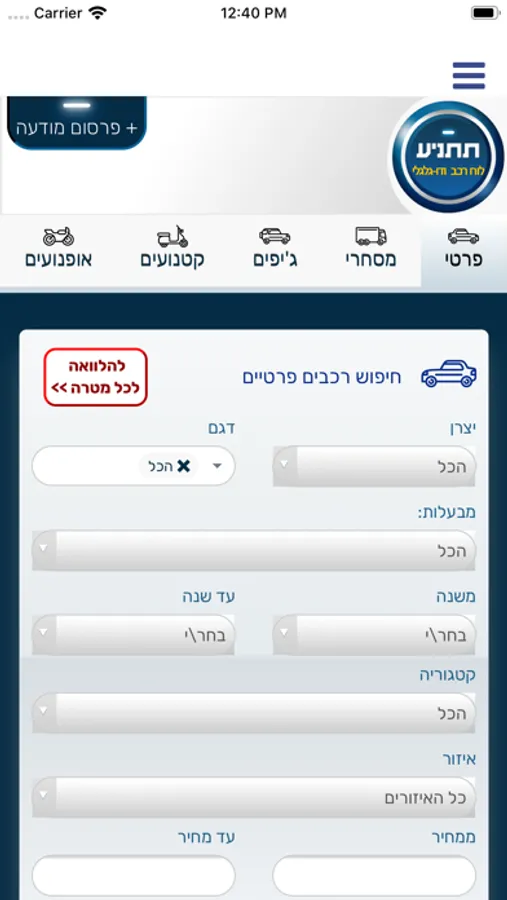 אנו מאפשרים לכל אחד להעלות מודעה פרסומית בנוגע לכלי הרכב שלו ולהציגה בפני קהל רחב של גולשים.