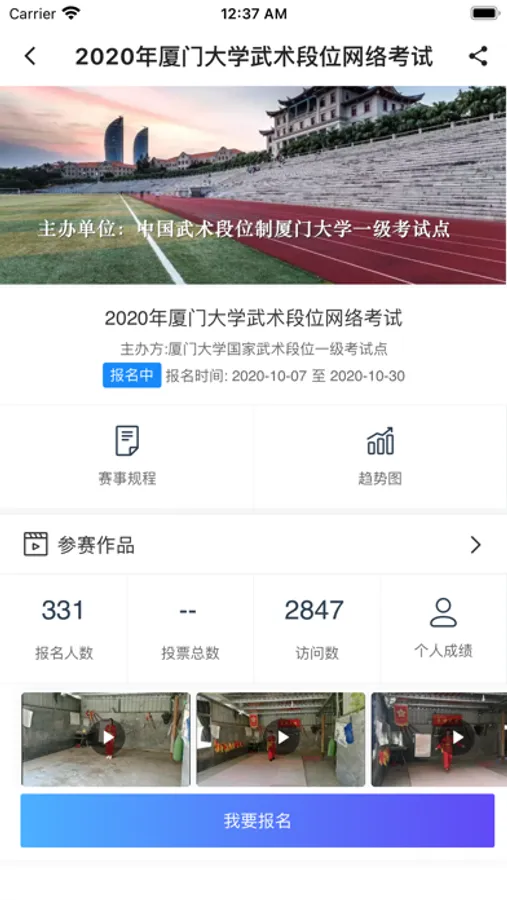 集合当前接入的各类武术赛事与资讯,查看比赛规程、赛程,实时查询成绩,查看赛场精彩瞬间,代表队人气投票,