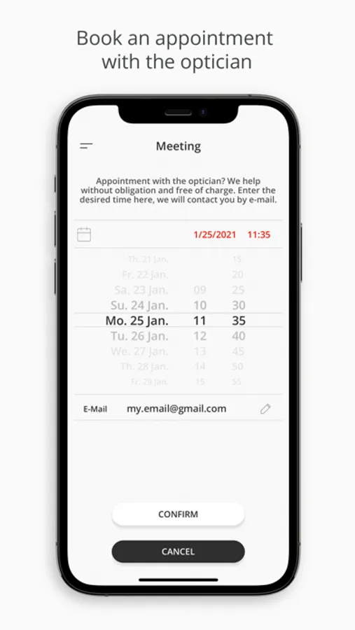 You can find the watch list in the main menu under "My Account". The reservation can be made from the wish list. This process includes a facial scan and, optionally, scheduling at the optician's. Registration in the app is required for the reservation. There are no liabilities without prior contact from Headrix. The app measures dimensions of the face relevant to the individual glasses, including the pupillary distance. The app creates a schematic 3D model of the face.
