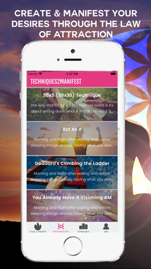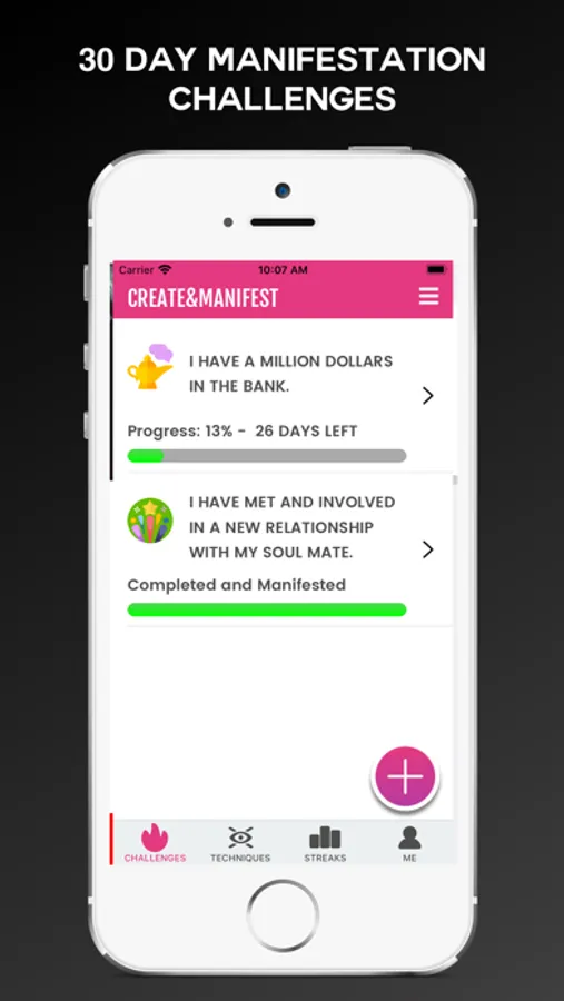 With Create & Manifest you can create custom 30 day challenges to manifest anything in your life using a variety of Law of Attraction techniques made popular by the likes of Neville Goddard, Abraham Hicks, Bob Proctor, Dr Dispenza, Dr Joe Vitale and others from The Secret.