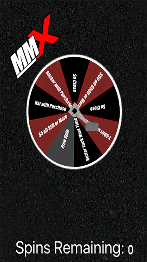 The MMX Parts app offers awesome features giving you greater control over your MMX account, access to your online shopping cart, and a chance to save some money on top of our already great prices -- all from the app! The "Play" feature is an in-app-only chance to win products or a discount. Try your hand at the wheel each time you load the app!