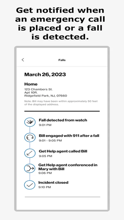 * Timeline of events displayed in the Care Smart app including when a fall was detected or an emergency call made or received from the Get Help - Professional Monitoring agent, emergency responders dispatched, trust circle alerted, and incident closed