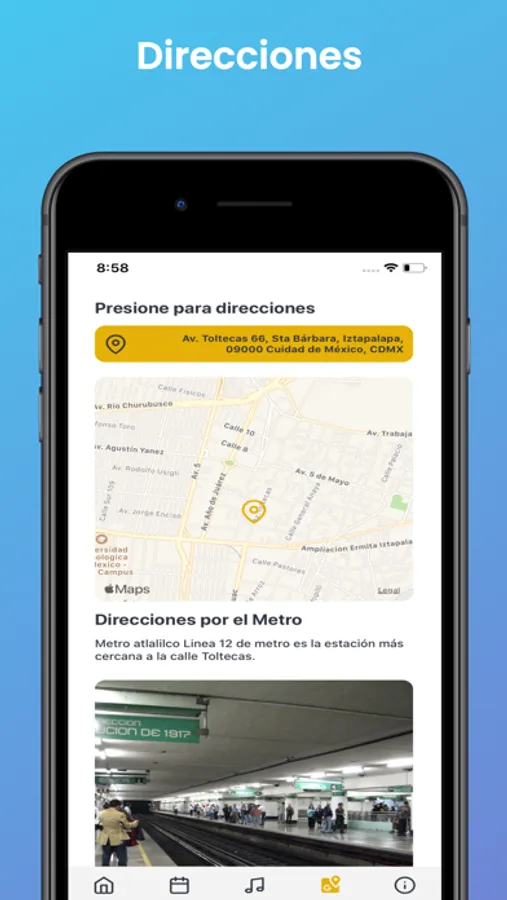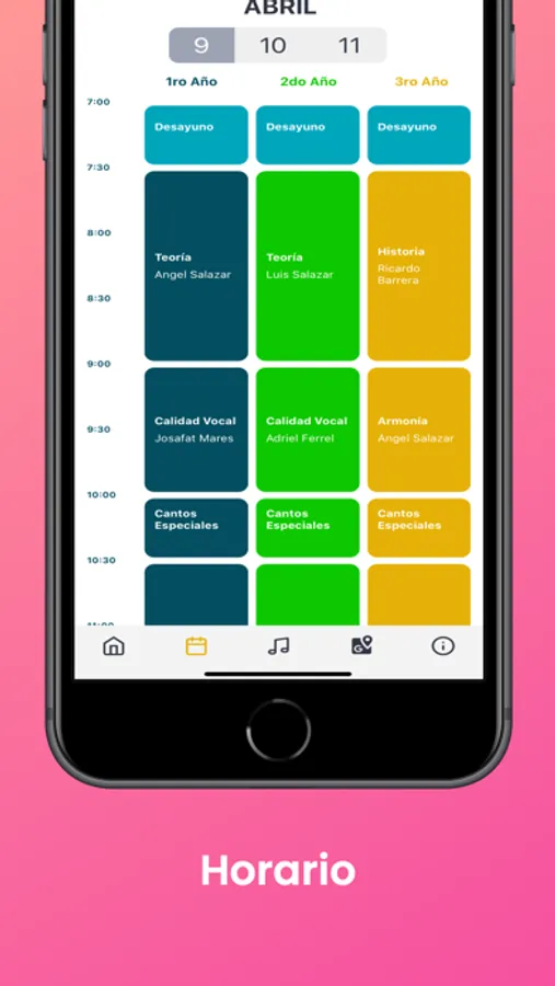 Información sobre el costo, el horario diario, himnos, las indicaciones para llegar al edificio y el propósito de la escuela.