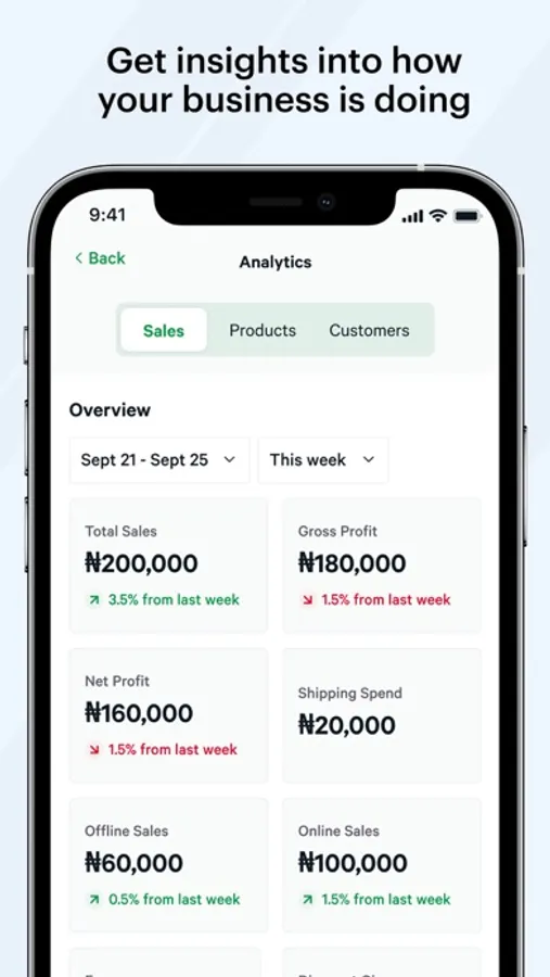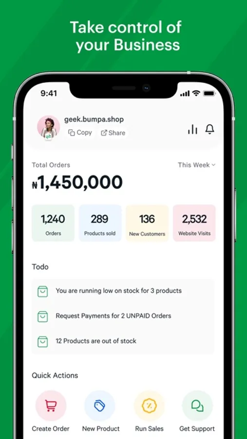Manage your online/offline store wherever you are. With Bumpa you can create an online store, manage orders and products, track sales, share across Facebook, Instagram and Twitter, accept payment, and send out notifications to your customers directly through the app.