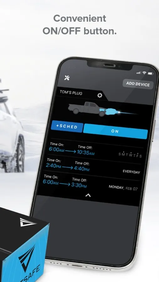 You can set up to 15 one-time or recurring schedules per device to automate when your VoltSafe Winter turns on and off! You can even manually control your device through the ON/OFF toggle feature for more flexibility and ease of use. The VoltSafe App unlocks the full potential of your Winter block heater plug!