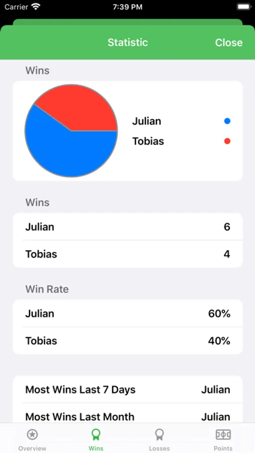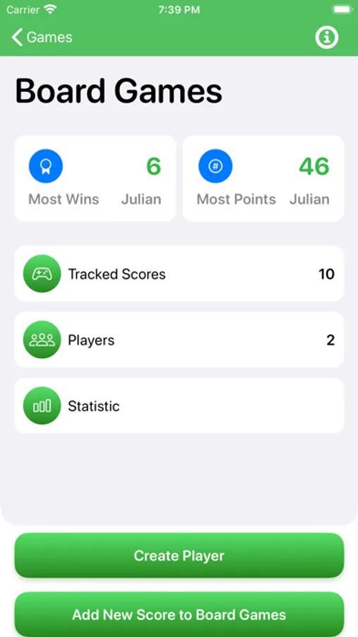 - Score Tracker generates a comprehensive statistical analysis. You will be able to get Information like Number Of Games, Win Rate per Player, Average Points and a lot more.
