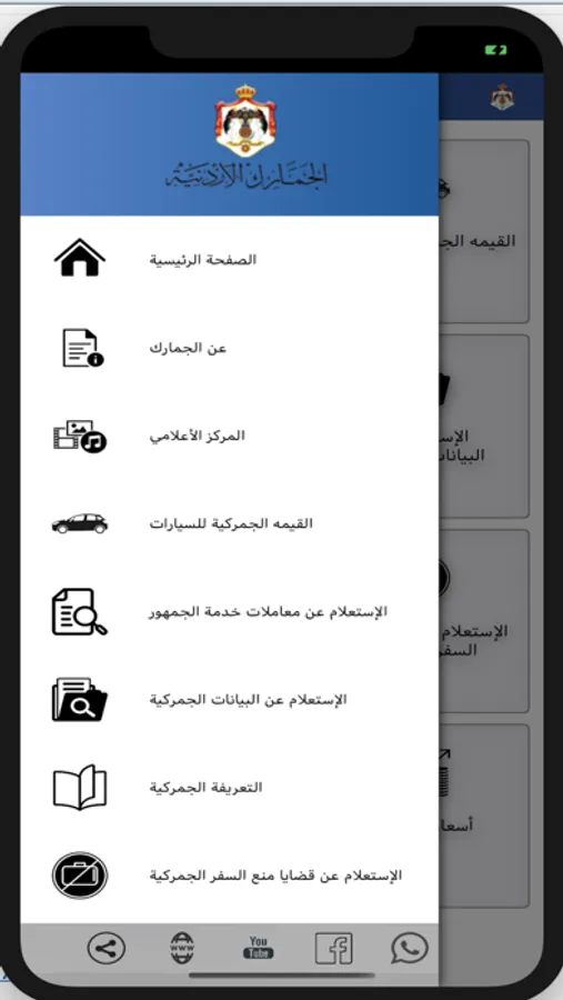 خدمة المركز الإعلامي للجمارك الأردنية، خدمة الاستفسار عن القيمة الجمركية للسيارات، خدمة الاستفسار عن الإيرادات الجمركية لأصحاب القرار، خدمة الشكاوى والمقترحات، خدمة معلومات المراكز الجمركية ومواقعها الفعلية من خلال ربطها على خرائط، و خدمة أسعار العملات .