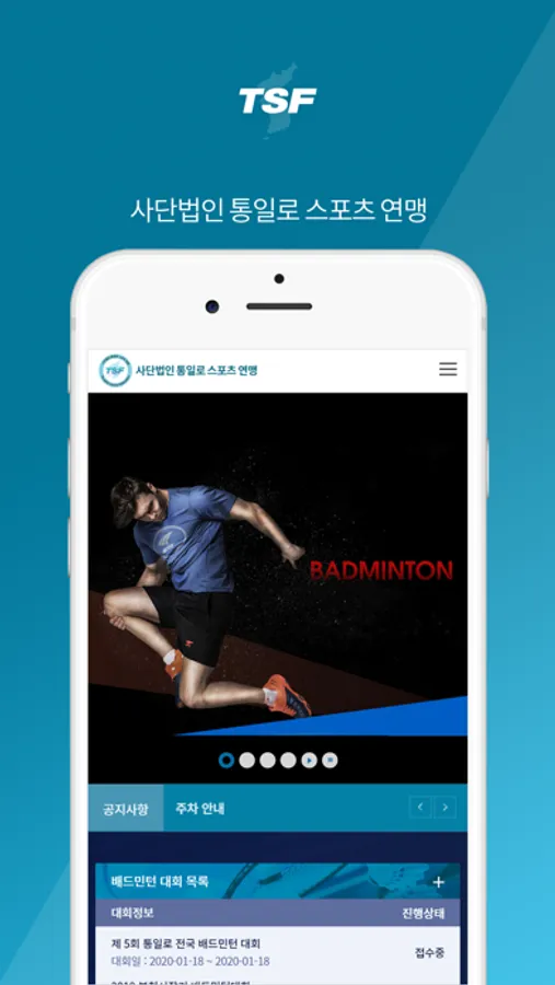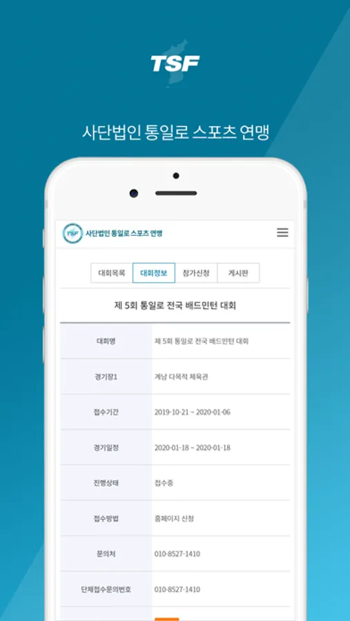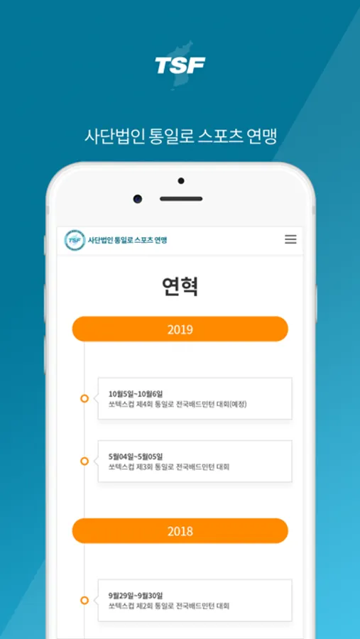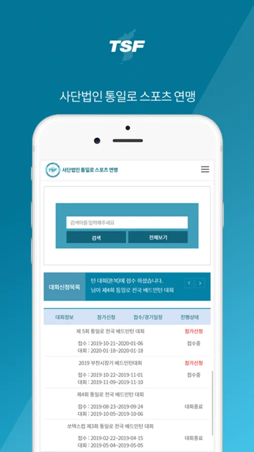 스포츠를 향한 열정과 배움을 향한 도전 정신을 가진 동호인 여러분들이 다양한 스포츠 활동을 손쉽고 가깝게 체험할 수 있도록 모바일 환경에 맞추어 대회 신청, 대진표 작성과 확인, 대회 운영 등을 손쉽게 하실 수 있도록 지원합니다.