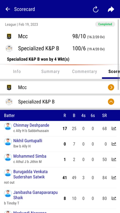 Users can view Player stats, Match Schedules, Scorecards.