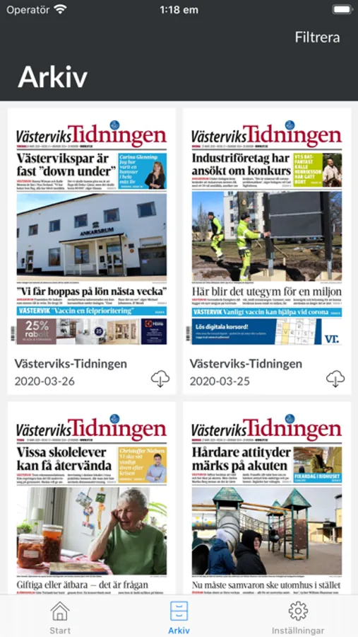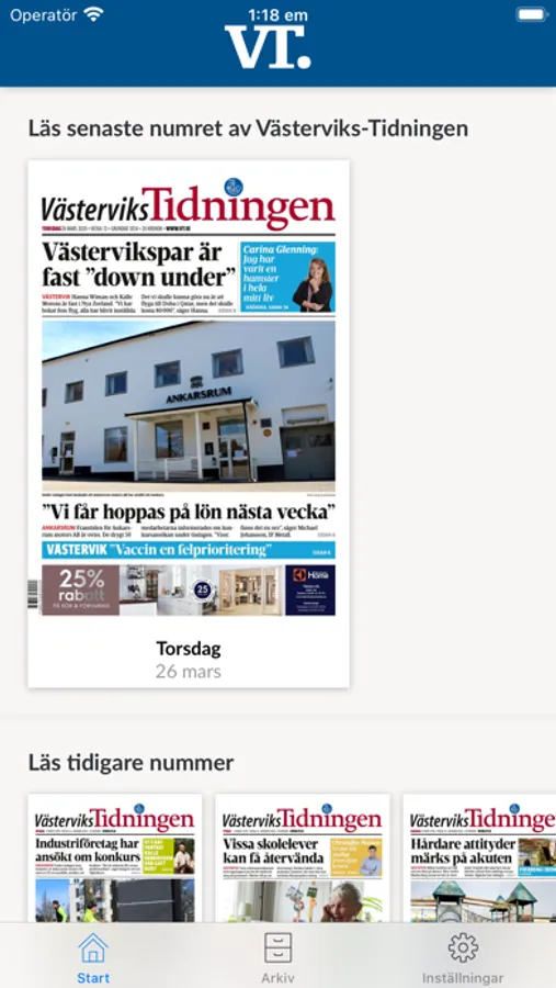 Välkommen till Västerviks Tidningen. Med e-tidningen får du en digital version av dagens tidning. Du väljer mellan artikelläge eller att bläddra i tidningen. Lika enkelt hämtar du tidigare utgåvor i arkivet. Du kan också ladda ned e-tidningen och läsa den off line, när det passar dig. Med oss följer du alltid det lokala nyhetsflödet, sporten, familj, kultur, ekonomi, näringsliv och mycket mer!