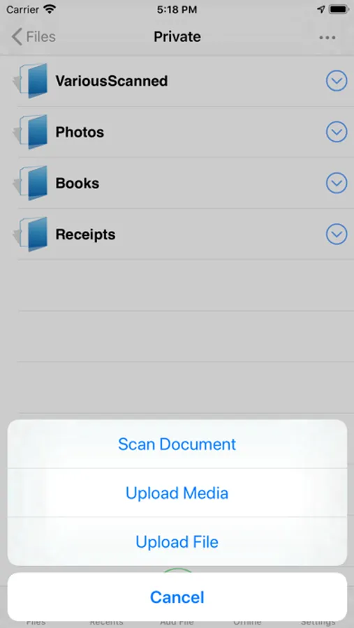 Ability to upload files to the system by scanning files or taking photos on the device camera.