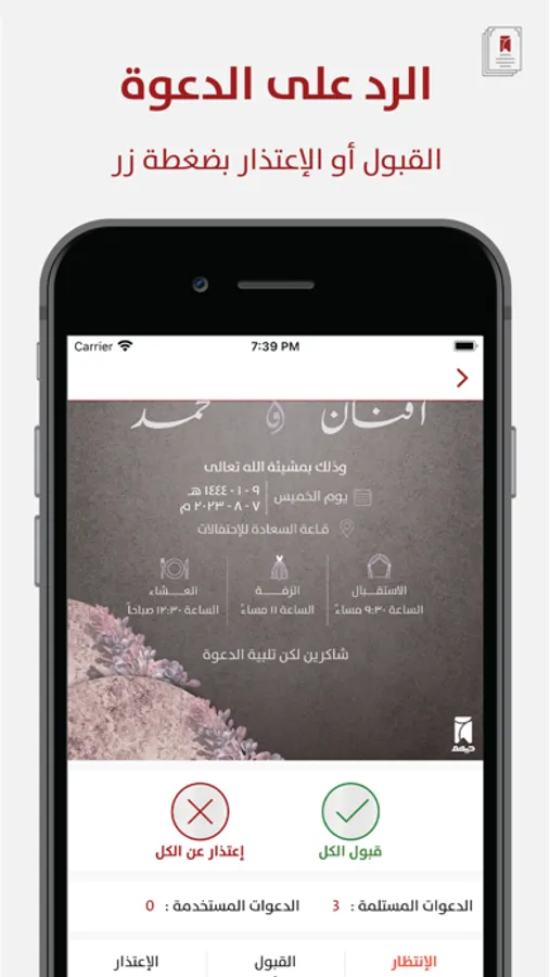 الرد على الدعوة المستلمة (بالقبول أو الاعتذار أو التحويل للغير حسب الطلب).