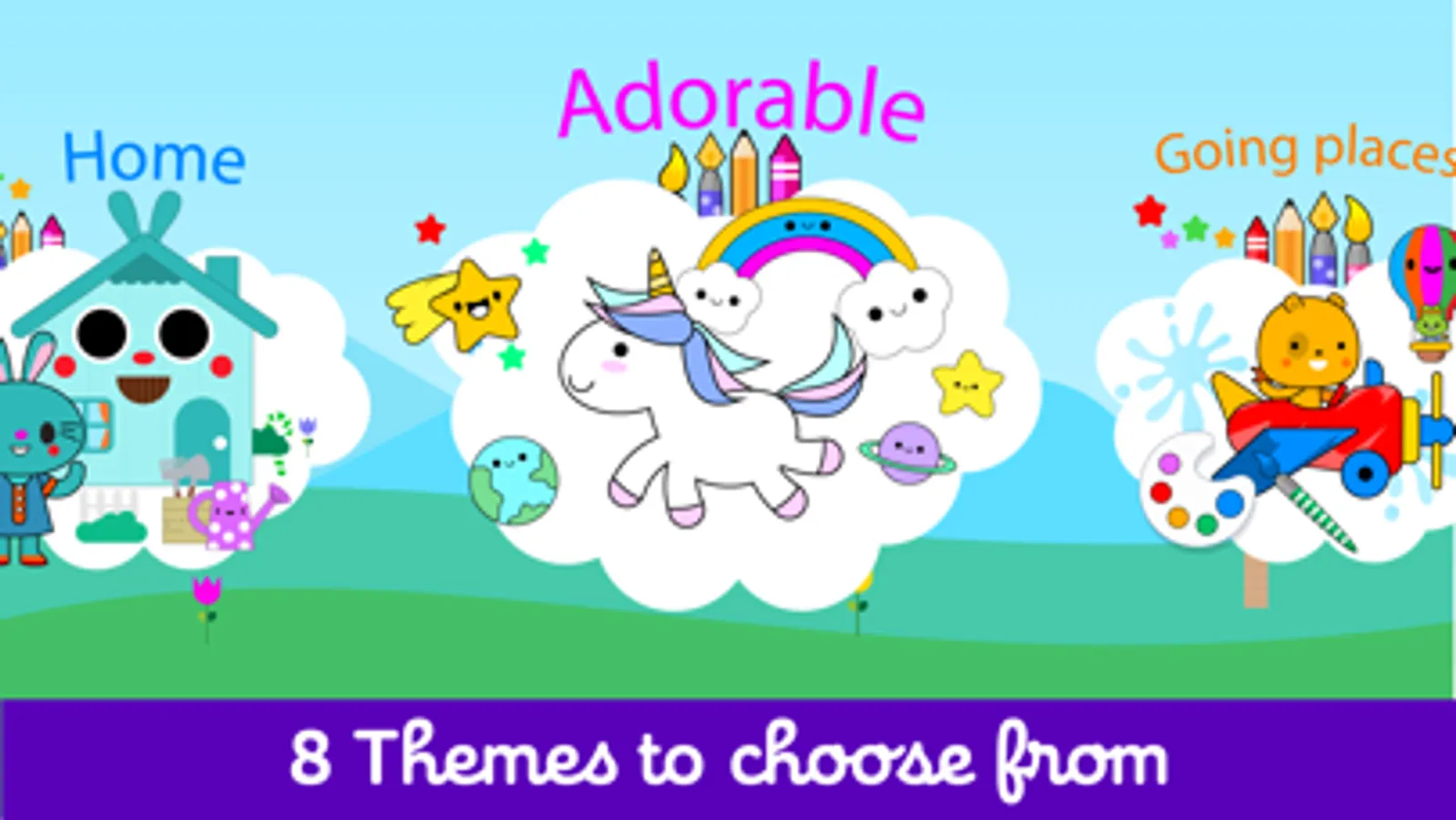 This exciting baby coloring book for kids has a bundle of fun for baby drawing & painting games for kids. They can enjoy toddler coloring paint and drawing games by selecting the character from 8 interesting themes. Through these kids drawing toddler learning games, they can show their creativity by choosing the character of their interest from lots of theme categories like Going PlacesCircus Cute NikNak HomeBeach City Nature and Adorable pet characters.